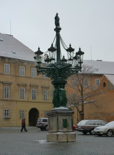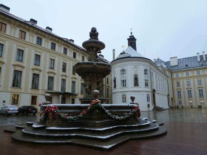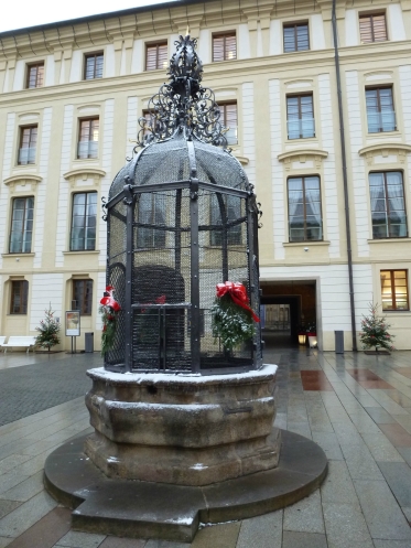 Через Матиашовы ворота, когда-то бывшие отдельно стоящей триумфальной аркой, покидаем первый Почетный двор и попадаем в двор второй, другого названия не имеющий. Взгляд сразу останавливается на стройной капелле Святого Креста, где сегодня находится Сокровищница Кафедрального собора Святого Вита, и величественном Львином фонтане, который, благодаря снежному орнаменту, смотрится еще более торжественно..