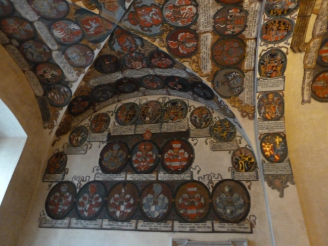 Стены и потолок так называемой Зеленой комнаты украшены гербами чиновников суда, размещавшегося в ней.
