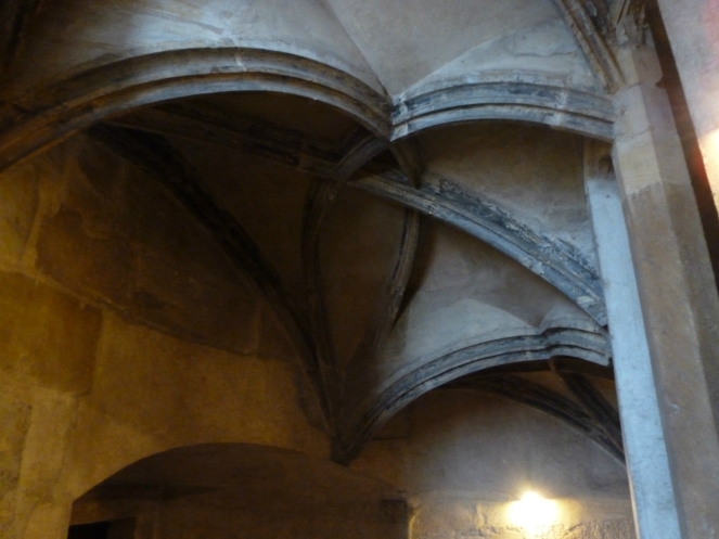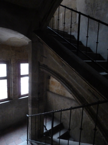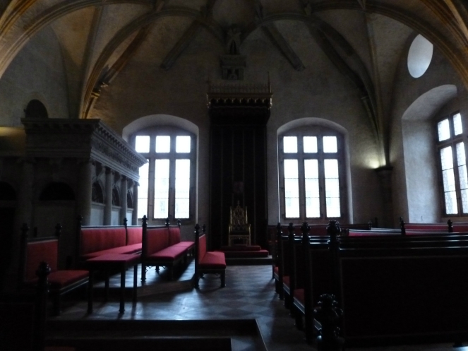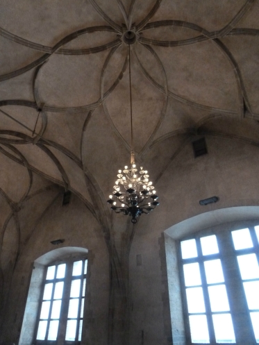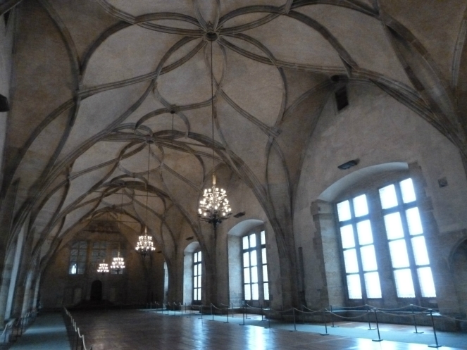 Благодаря свету, пробивающемуся через высокие окна, можно разглядеть необыкновенные своды, увитые каменными цветами, и ощутить огромность старинного тронного зала. Остальное дофантазируем – какие здесь проводились торжественные церемонии и пиры, а в более ранние времена рыцарские турниры. Да-да в зал въезжали на лошадях! Именно для этого была предназначена широкая лестница, по которой сейчас во дворец входят туристы.