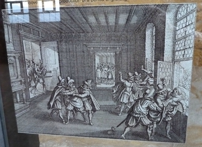 Дефенестрация в Пражском граде имела место в 1618 году - протестанты, добиваясь одинаковых прав с католиками, выкинули из окон королевской канцелярии двух наместников и писаря. На этот раз «жертвы» остались живы, угодив в огромную кучу нечистот, кои в то антисанитарное время скапливались под стенами замков, дворцов и домов (похоже, дверца в углу – это как раз то, о чем я подумала).