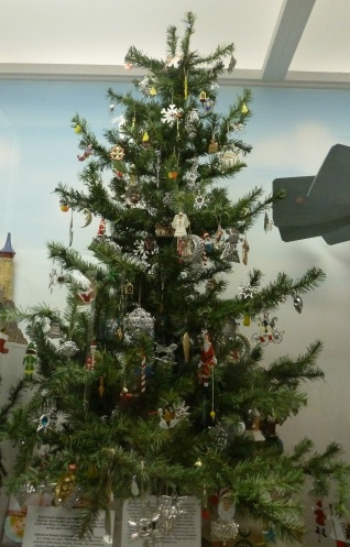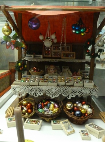 миниатюрные елочные украшения и уже украшенные елки, ведь скоро Рождество,