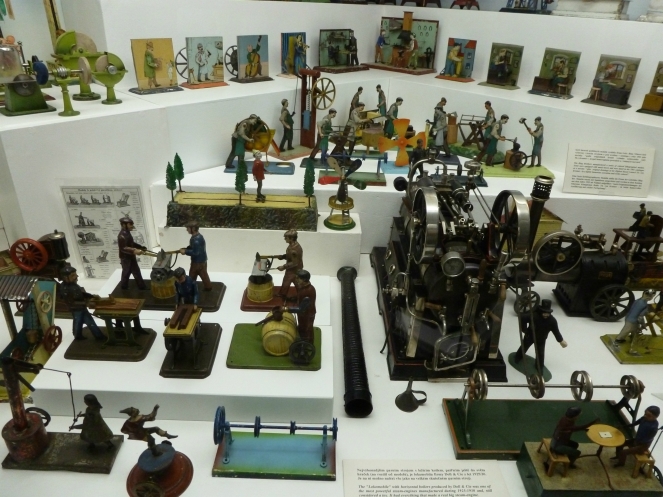металлические и деревянные конструкторы, автомобили, корабли, самолеты, цирк и зоопарк и ещё много-много различных экспонатов.
