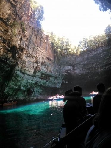 Озеро Мелисани, самое запоминающееся место из поездки на Кефалонию! И пещера, и озеро, и обрушенный свод, через который пробивается солнце и освещает пещеру и воду, и вода в озере пресная, но солоноватая, как слёзы, и красивая легенда, связанная с этим.