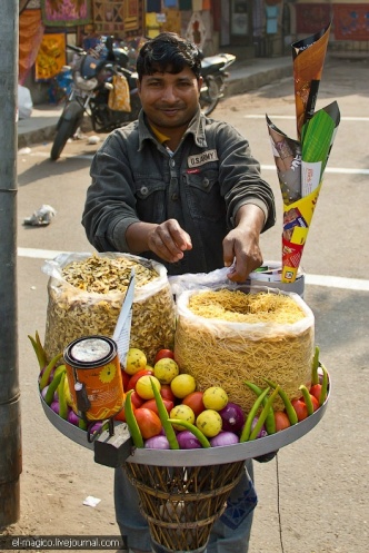 4. А это торговец адски острой закуской. На твоих глазах тебе перемалывают чили, лук, помидор, лимон и дают в прикуску к этому соусу еду, напоминающую по внешнему виду, чем то татарский чак-чак. Насколько я любитель острого и уличной кухни, но экспериментировать не стал, впереди был еще целый день и хотелось его провести гуляя по городу, а не в поисках туалетов.