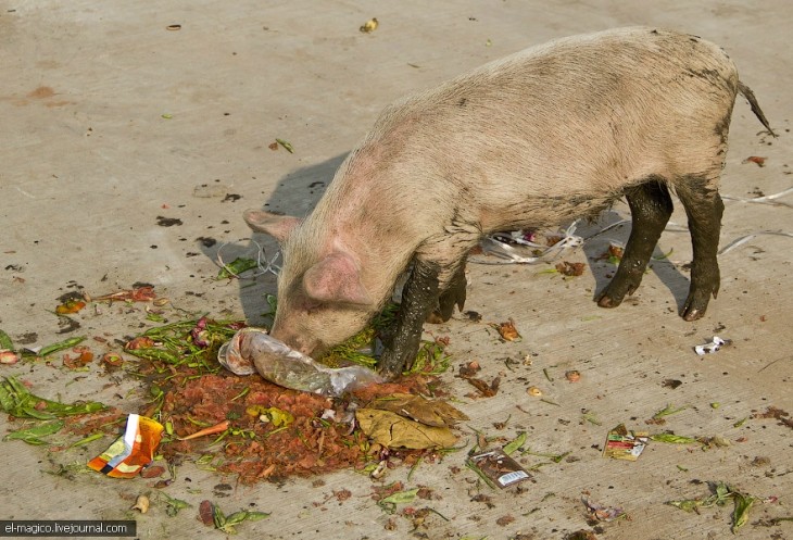 27. Прогуливаясь по городу, прямо на наших глазах из дома человек кинул из окна пакет с отходами. Местные свиньи заурчав от радости вылезли из грязи и набросились на пакет. Напоминаю, что всё это происходило в городе.