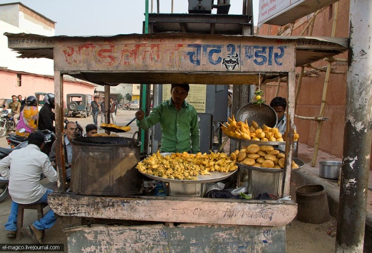 5. Уличная еда во фритюре на улице. Справа снизу - это лепешки, которые просто раздулись. Треугольнички сверху - самса, которую в Индии называют "самОса". Всё вегетарианское. Обратите внимание на лимон и перец висящие на веревочке. Это используется не в качестве еды, а в качестве оберега от сглаза, защиты от демонов и т.д. Обычно такое вешают на дверью дома.