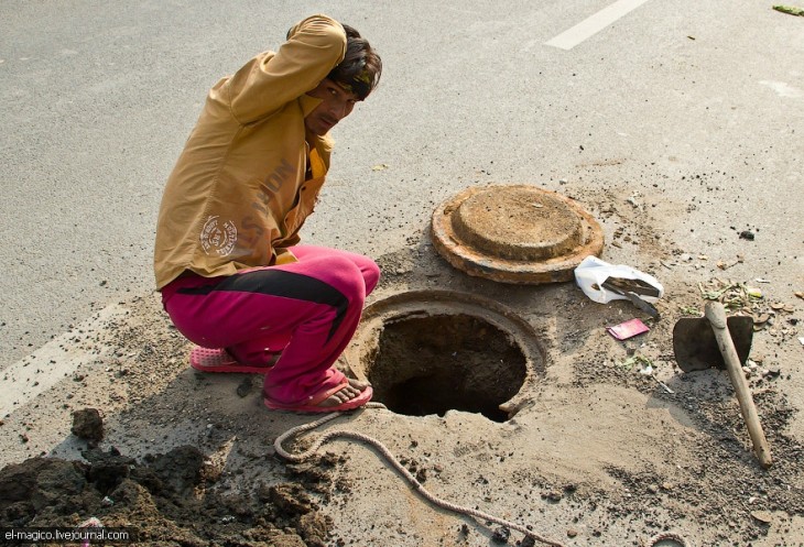 13. Вообще, в Индии постоянно везде идёт ремонт. В основном он касается только дорог, здания особо не трогают. Посмотрите насколько маленький люк. Диаметр в раза полтора меньше чем у нас.