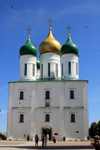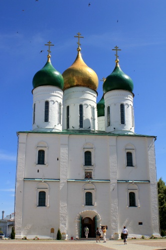 У собора интересная история. Трехкупольным он простоял только до 1672 года и из-за ветхости был разобран. На его месте за десять лет возвели новый храм о пяти куполах, а в 1804 году его заново расписали. За все это время собор несколько раз был сильно разрушен и разграблен. Сейчас этот белокаменный собор с пятью разноцветными главами, безусловно, является украшением Соборной площади.