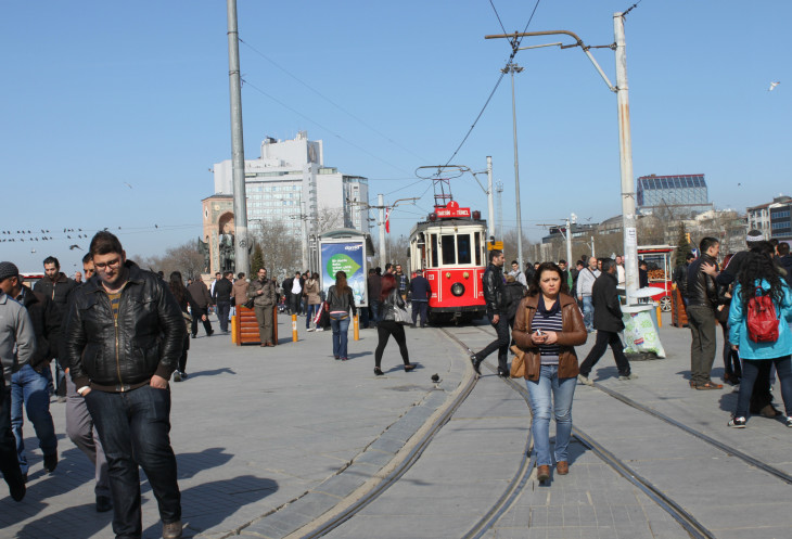 Очень большое скопление народа на знаменитой улице - распогодилось и очень хорошо потеплело. Много местных и иностранных граждан гуляет по узкой улице Истикляль, иногда мешая старомодному трамваю двигаться по своему маршруту.