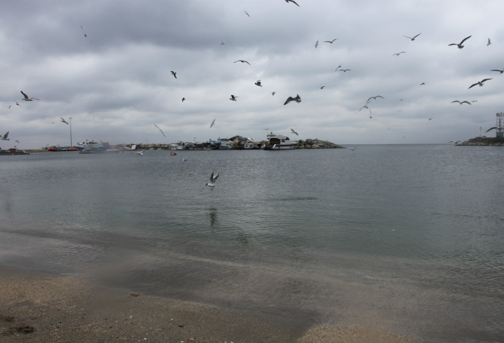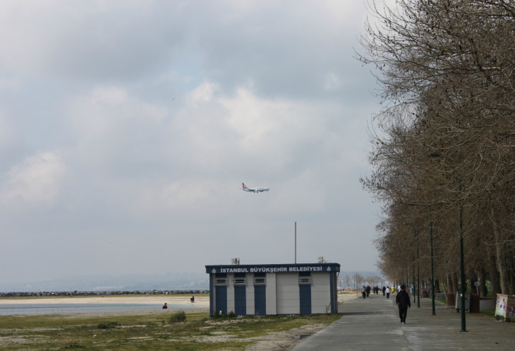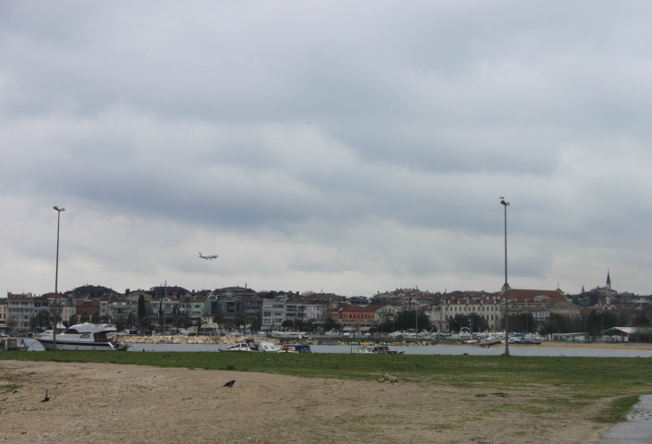 сели в долмуш, и отправились вдоль побережья по направлению к аэропорту Ататюрк. Прогулка на долмуше от начальной до конечной точки путешествия заняла примерно минут 30, может быть быстрее, может быть и дольше: я потеряла совершенно счет времени, любуясь заоконными пейзажами. Делать снимки из долмуша не получается, поэтому их почти и нет. Очень запомнились старые крепостные стены, за которыми углядывались лачуги и более цивильные дома, по другую сторону можно было наблюдать молочно-серую гладь Мраморного моря, с разными трейлерами и небольшими судёнышками.