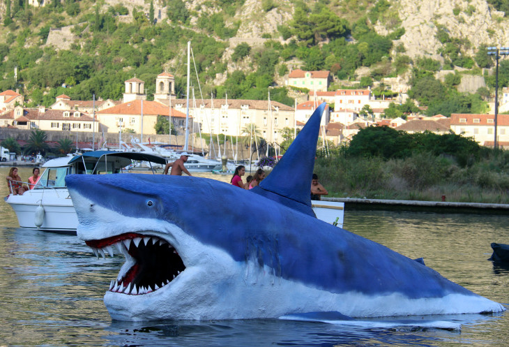 Акула была потрясная - из ее пасти на узком плоту выкатывался человек, истошно голося и призывая к помощи, а специальный механизм внутри акулы накручивал веревку плота назад, снова в пасть акулы. Вот так бедняжка на плоту и курсировал взад-вперед из акулы и обратно, хаотично махая руками, и, очевидно, нецензурно ругаясь) и крича SOS!