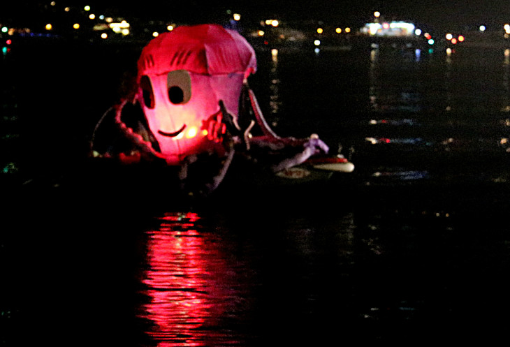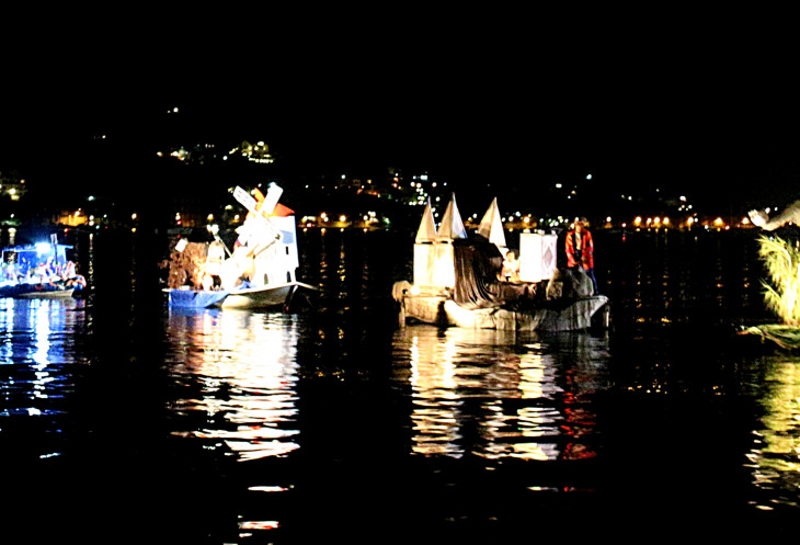 Я никогда в своей жизни не видела столько людей! И столько радости! Мастерски оформленные лодочки, которые мы до этого видели при свете дня, вдруг преобразились, освещаемые фонариками, эти произведения искусства, приязанные по несколько штук веревкой к тянувшей их лодке, медленно проплывали мимо взрывающихся от восторга, апплодирующих и улюлюкающих зрителей и серьезно настроенных, но улыбающихся судей.