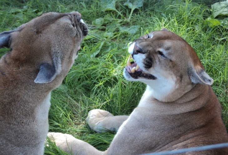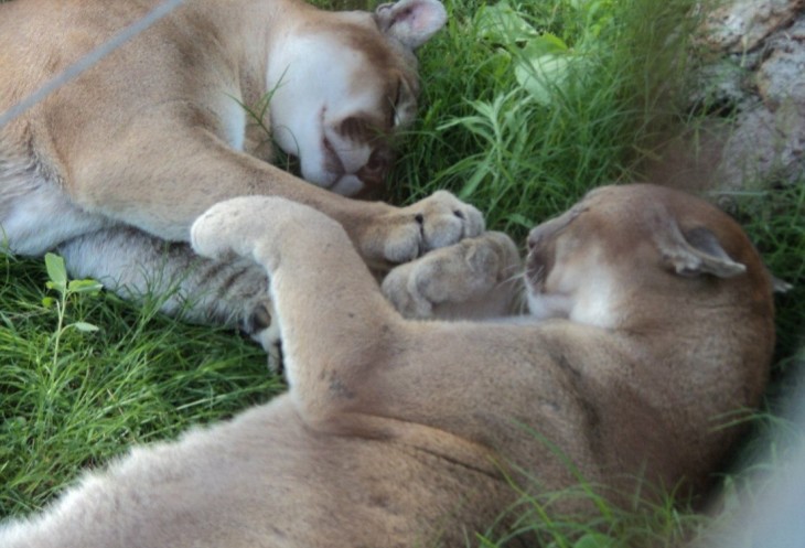 А во второй наш визит мы стали невольными свидетелями их брачных игр — пумы то рычали друг на друга, обнажая зубы и прижимая уши, то нежились вместе и, опять же, громко мурлыкали.