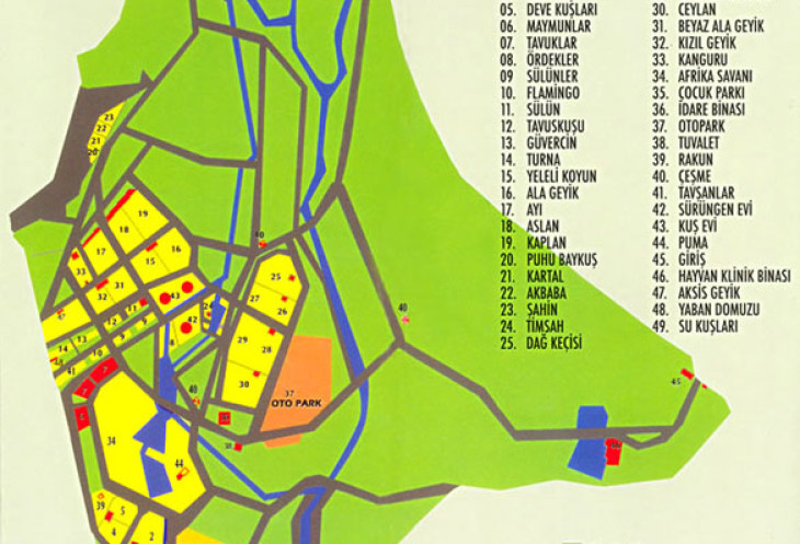 Ниже представлен план анталийского зоопарка, который наверняка будет полезен потенциальным посетителям. На схеме зеленым цветом обозначена парковая зона, жёлтым — открытые вольеры с животными, а красным — крытые.
