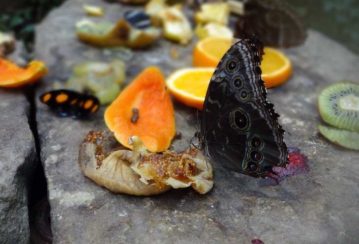 Очень интересен павильон бабочек и теплолюбивых расстений. Можно наблюдать, как бабочки пьют нектар и сок с апельсина и инжира. Павильон большой и можно побродить по тропинкам: здесь есть переходы, ручейки, небольшие подъемы и спуски, даже скамеечки, чтобы присесть и неспеша полюбоваться райским уголком природы.