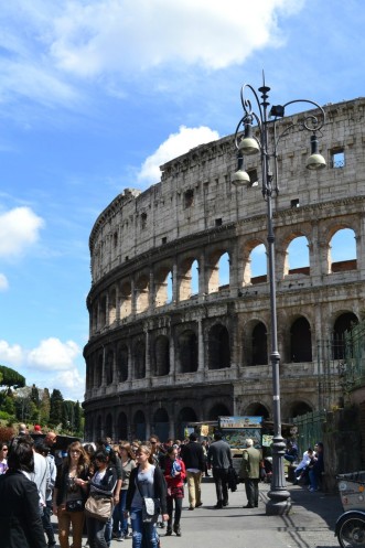 Насладившись видами города со смотровой площадки, мы отправились к следующему пункту нашего маршрута - Колизею. Римские форумы находятся ближе, как раз между Капитолийским холмом и Колизеем, но мы решили сначала посетить самую известную в мире арену, а уже потом не спеша побродить по форумам. На подходе к Колизею стоят во множестве итальянские граждане, переодетые римскими то ли воинами, то ли гладиаторами, сразу и не поймешь. С ними за определенную мзду можно сфотографироваться.
