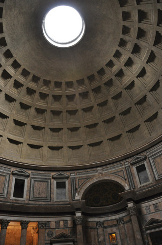 Внешне Пантеон не производит впечатления столь уж величественного сооружения и больше похож на причудливой формы склад, чем на храм. Каменная бочка приличных размеров без окон и дверей. Что в ней может быть величественного? И даже портик из шестнадцати гранитных коринфских колон, через который вы проходите, чтобы войти в Пантеон, еще не служит причиной, чтобы поменять свое мнение. Но все это лишь до того момента, пока вы не войдете внутрь здания.