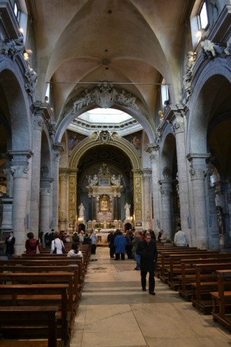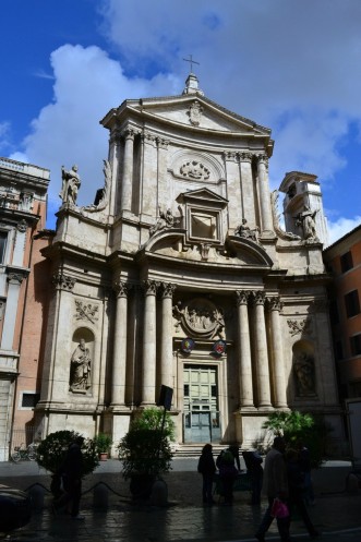 Немного, правда подкачала погода. Только мы пересекли Тибр, как поняли, что от дождя нам не убежать. Приближалась черная дождевая туча. Решили спрятаться где-нибудь. А тут как раз на площади рядом с нами стоит церковь Сан Карло ай Катинари.