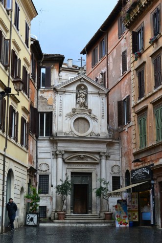 От церкви мы двинулись по "via Giubbonari" и почти тут же в глубине улицы, зажатую между домов, увидели одну из самых маленьких церквей Рима - Церковь Святой Варвары.