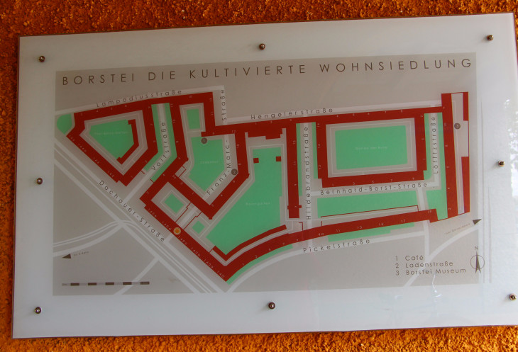 Место это действительно оказалось интересным и называлось " Жилой квартал Борстай". Находится он к северо-западу от центра города, рядом с Олимпийским парком. Район расположен между улицами Dachauer Strasse, Lampadiusstrasse, Hengelerstrasse и Pickelstrasse, а добраться до него можно либо на метро (станция "Westfriedhof" линии U1), либо на 20 или 21 трамвае от Карлсплатц или от главного вокзала.