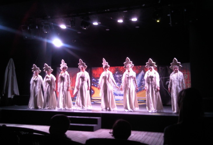 Зал заполнился наполовину и представление началось! Начало было эффектным! Под потолком висели пять девушек-японок с горящими глазами. А потом начались синхронные танцы, лезгинка, шоу с барабанами и битва на мечах со щитами, во время которой хорошо были видны искры, кстати. Все это длилось два раза по 45 минут с перерывом 20 минут, раз в неделю получается. В перерыве внизу можно было купить напитки, кофе и еду. В конце руководитель шоу на сцену, к сожалению, не вышел, но иногда выходит, как рассказала гид.