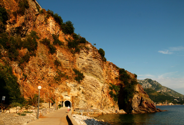 Пляж перед туннелем, по которому можно пройти на пляж в Каменово - очень живописен! А скала, через которую проходит туннель - чуть ли не самая живописная на всём побережье в Черногории!!
