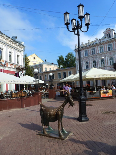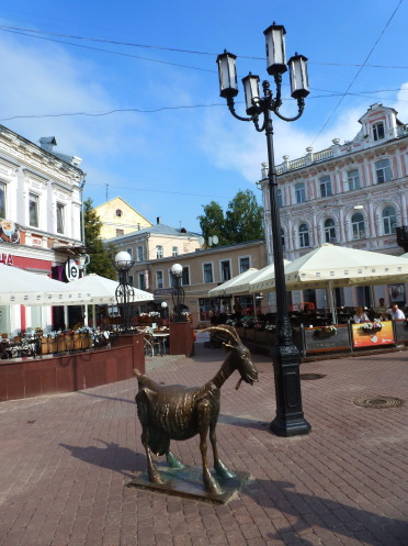 Это смешное изваяние появилось здесь в 2005 году. С 1993 года коза является забавной эмблемой ежегодного всероссийского фестиваля театральных капустников. Говорят, история веселой козы связана с символом города – оленем. Многочисленные неаккуратные перерисовки его изображения привели к значительному искажению и стали  вызывать улыбку. Вот и окрестили намалеванного оленя «веселой козой».