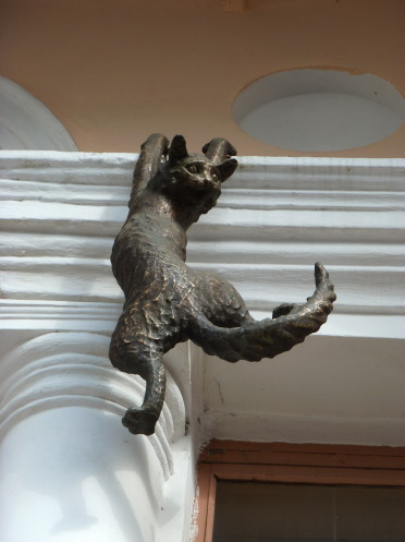 А напротив, гляньте - забавные коты гоняют голубей на фасаде дома 4а, где расположен Учебный театр Нижегородского театрального училища им.Е.Евстигнеева.