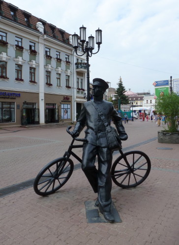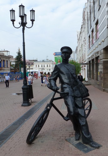 В самом конце пешеходной части Большой Покровской улицы у отделения Почты России остановился, опираясь на велосипед, почтальон.