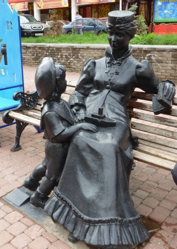 Так, устроившись на лавочке, гувернантка рассказывает что-то интересное своему воспитаннику. Настолько интересное, что к «Гувернантке с мальчиком» пристроился дяденька…
