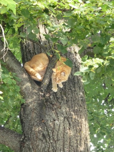 Но оказалось, что не одни мы бодрствовали в столь ранний час. Два кота-жениха стерегли под деревом рыжую красавицу-кошку, которая забравшись наверх, недовольно голосила, нарушая утреннюю тишину. "Женихи" завистливо облизываясь, кружились на месте, выгибали спину и бросали пламенные взгляды, на что потенциальная невеста, сменяя гнев на милость, переходила на зазывное мурлыканье. Она явно дразнила незадачливых кавалеров, у которых добраться до нее, похоже. оказалась "кишка тонка". Я так и представила, что красотка сейчас покажет котярам язык, и вместо обычного "мяу" я услышу издевательское "бе-бе-бе!"