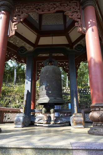 К священному колоколу.Муж залез в колокол,по приглашению монаха,и тот три раза стукнул его (колокол) бревном).