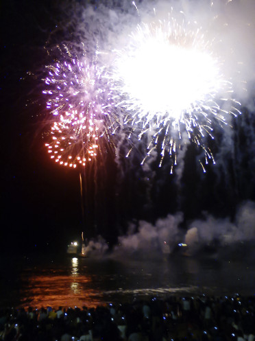 Ближе к двенадцати мы увидели как подходят два катера с разных сторон. И вот началось!!! С первым залпом толпа вздохнула и перестала жевать и пить.Пятнадцать минут длилась канонада салюта.Люди хлопали,что то кричали,некоторые затаили дыхание.Фейрверк был красивый!!!