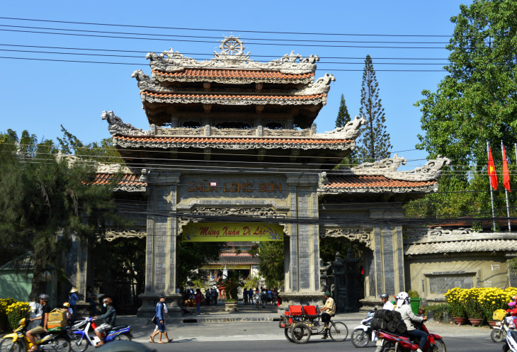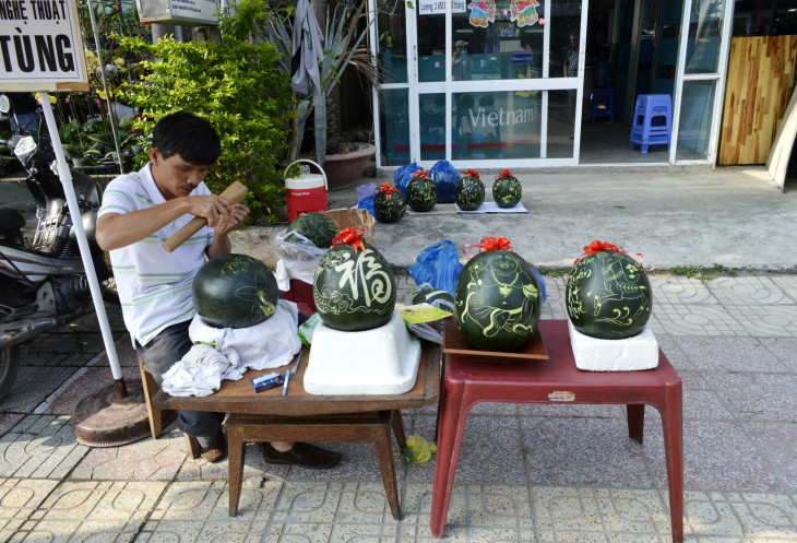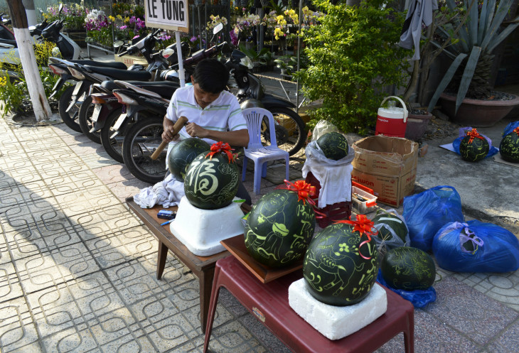 Сначала пошли к пагоде Лон Шон.Пока шли посмотрели художественную резьбу по арбузам.Парень вырезал новогодние поздравления на корке арбуза и продавал их.