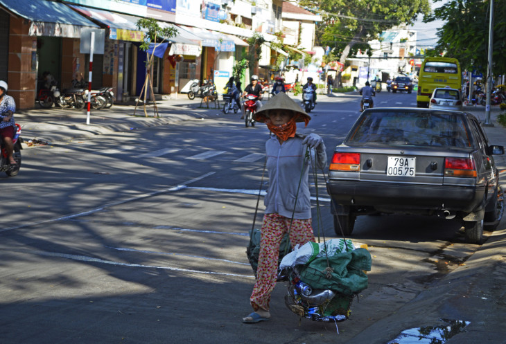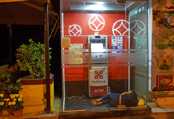 Незадолго до отъезда,мы решили сходить посмотреть как вьетнамцы делают зарядку в пять утра на берегу моря.Вышли на улицу - еще темно,тихо.Редкий байк проедет.Идем на набережную,по дороге видим человека,спящего в будке банкомата.