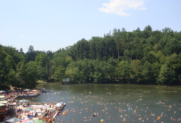 Озеро уникально в том смысле, что снизу очень соленая вода, а сверху слой пресной воды, через которую, как через линзу, соленая вода нагревается. Ну а если не давать воде восстановиться, то чудесные свойства озера пропадут. Оно прогревается где-то к концу июня до 50°С на глубине 1,5 метров, а затем постепенно остывает. Мне 27°С в августе было вполне достаточно: даже когда дождь шел, в воде было тепло. Зато в дождь намного меньше народа, а в хорошую погоду да еще в выходные негде полотенце постелить, почти по головам ходят. Один раз попала под град — не очень приятно, но шапочка для душа спасала. Все-таки решила выйти из воды, потому что началась сильная гроза, и перед глазами всплыл кадр из фильма моей юности «Великолепный» с Бельмондо: когда герой выплевывает капсулу с ядом в бассейн, потом по нему плавают трупы. Если бы молния шарахнула в соленое озеро, так бы и было. Ну а когда просто моросил дождь, я накрывала сумку с одеждой полиэтиленовым плащиком и шла купаться. Какие-то мужики, которые висели в воде, весело сказали что-то, наверное: «Еще одна полоумная», но я им улыбнулась и поплыла к буйкам. Термин «висеть» лучше всего отражает процесс купания в озере: оно настолько соленое, что торчишь в воде, как поплавок. Некоторые зачем-то пользовались кругами и нарукавниками для плавания, но это совершенно лишнее. Круги используют в Хевизе, чтобы позвоночник расслаблялся в целебной воде. А здесь в воде можно стоять и ходить, не касаясь дна. Незабываемое, восхитительное состояние! Когда народу было поменьше, я плавала, а когда в воде не протолкнуться, занималась аквааэробикой. Меня все время преследовала песенка: «Ехали медведи на велосипеде…», наверное, потому что озеро называется Медведь, а я делала упражнение «велосипед» не лежа на спине, а вися в воде. Если немного загребать ступнями, то можно передвигаться по озеру. В первый день немного переборщила: пожалела надеть панамку перед заходом в соленую воду, в результате нос и плечи немного пригорели (не трагично, все-таки критский загар еще не сошел), ну а потом ни панамку, ни средство от загара не жалела. Там почти все купаются в озере в шляпах, причем видела даже мужчин в совсем женских шляпах, с цветами и бантиками. Ну и правильно, голова дороже!