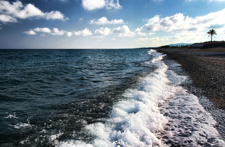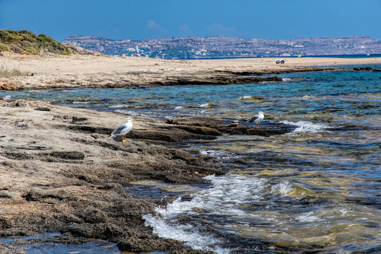Довольно большой и очень приятный пляж, оборудован, имеются и водные развлечения. Людей там много – как я понял, рядом расположены гостиницы, кого-то привозили на микроавтобусах – наверное, шаттлы из отелей. Но места хватает всем. Вообще, я не видел на Родосе забитых под завязку пляжей, таких, например, как пляж Анапы. Там себя чувствуешь как в транспорте в час пик. А на пляжах Родоса все размещаются комфортно… Вход в море кое-где крутой, иногда в воде попадаются каменные плиты, но не у самого берега. А на дикой части можно полюбоваться огромными чайками.