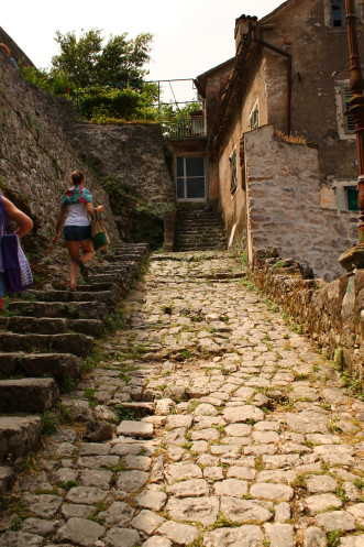 Все боятся, что тяжело будет подниматься на крепость - а мне лично было тяжелее спускаться... Поднималась-то я где по ступенькам, а где - по дороге, а спускаться пришлось исключительно по ступенькам... Что очень тяжко для тех, у кого, как и у меня, проблемы с голеностопным суставом (несколько раз были серьезные растяжения связок). Попытка спуститься по дорожке рядом с лесенкой чуть не закончилась грандиозным полетом с приземлением на пятую точку - спасибо мужу, поймал... Больше я попыток не делала - и без того отполированные многочисленными ногами туристов камни после дождя напоминали асфальт во время гололеда... Даже резиновая подошва по ним скользила...((