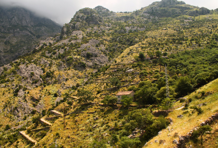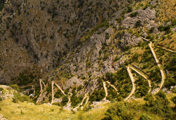 Что там может быть интересного – я и представить не могла. Меня всегда озадачивало – зачем на этой горе была построена защитная крепость Котора, если выше этой стены всё равно идёт гора? (см. первое фото заметки) А когда я залезла на маленькую площадку у самого верха стены, на которой он стоял, и глянула за стену… То действительно – ух!! За крепостной стеной Котора оказывается – не гора, идущая вверх, а глубокое ущелье, с отвесными склонами и с нашей, под крепостью, и с противоположной стороны… Крепостная стена спускается левее – до самой речки Шкурда, на которой находятся Северные (речные) ворота Старого Котора, а от речки поднимается вверх по склону ущелья серпантинистая широкая тропа, уходящая далеко наверх вправо – на гору, которая выше крепости Святого Ивана. Я прям ахнула: мамочки, так это же древняя «лестница Каттаро» – та самая древняя дорога, по которой местные жители ходили ещё во времена древней Зеты (так в средние века называлась Черногория) от порта Котора к деревне Негуши и далее к Цетинье! Это про нее мне рассказывал таксист Веско в сентябре 2012го года, когда возил меня вокруг Ловчена: http://www.rutraveller.ru/note/1650 .