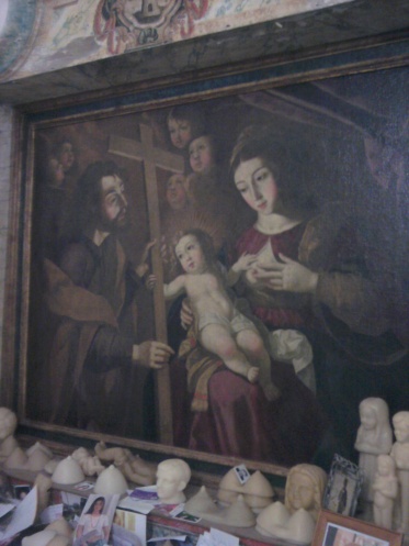 На ней изображена кормящая Богородица, Младенец и Иосиф. Младенец отворачивается от брызжущего из груди Марии молока и тянется к кресту в руках Иосифа. Отказ от земных благ ради служения Богу- девиз Босоногих Кармелиток. Весь алтарь усыпан восковыми миниатюрами женской груди и записками с просьбами к Кормящей Богородице об исцелении от рака груди, выздоровлении детей, хорошем исходе операции. Говорят, картина чудодейственная. К счастью, у меня не было причины проверить это утверждение на себе.