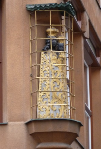 Вполне современное здание было построено в начале XX века к ужасу пражан, ведь оно абсолютно не вписывалось в стиль улицы Целетной, являвшейся частью древней Королевской дороги. С какого по счету разрушенного предшественника перекочевала черная фигурка за золотой решеткой, сейчас, пожалуй, вряд ли кто скажет, но, как и подобает божьей избраннице, она смиренно приняла свое новое местожительство.