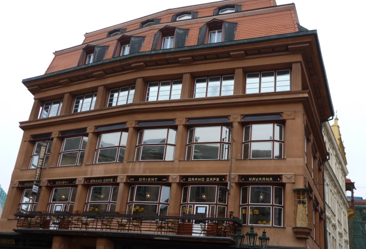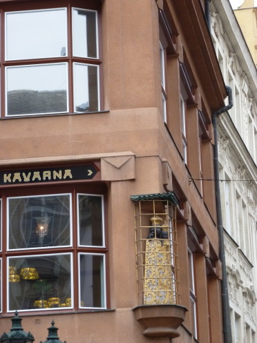 Напротив кубистского дома «У Черной Богоматери» находится кажущийся вполне современным дом, фасад которого украшает большая позолоченная статуя ангела. Нет, ну надо же, на моем фото он спрятался за уличными часами!..
