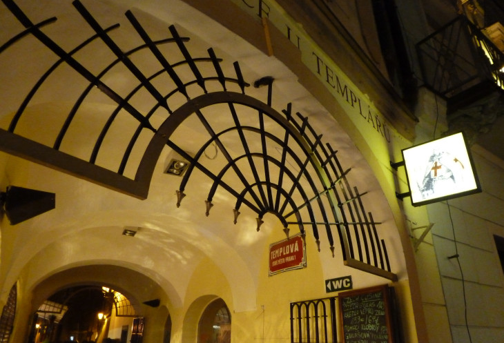 Дом «У Золотого ангела» только притворяется новым (фасад отреставрировали в XIX веке), на самом деле его история насчитывает почти семь столетий. Первое здание в готическом стиле появилось на этом месте в начале XIV века и было не чем иным, как резиденцией легендарного рыцарского ордена тамплиеров. Память об этом сохранилась в названии прилегающей к дому и достаточно необычной улочки Темплова.