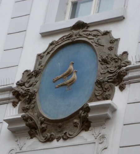 Пара голубей уже в средневековье символизировала счастливую супружескую пару и часто изображалась на свадебных вышивках, перстнях, заколках, мебели, поэтому дом постепенно переименовали в ласковое - «У Двух белых голубок».