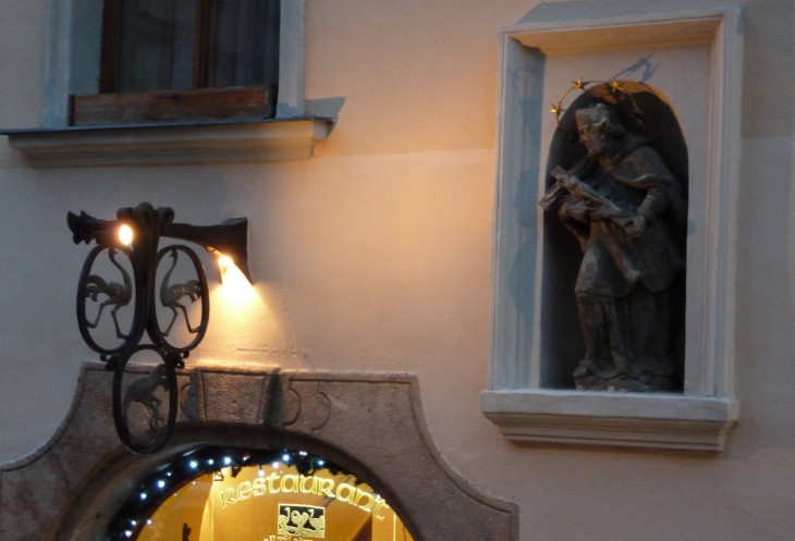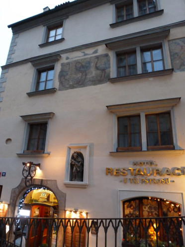 Кстати, камушки, придающие зданию серьезность и основательность, - это всего лишь роспись в технике сграффито. В XV веке дом «У Черной звезды» принадлежал ювелиру Фридлину, затем ножовщику Михалу Цваягру. В середине XVIII века владельцем дома стал граф Бедржих Ностиц, тогда здание прозвали Малым Ностицким домом. В конце XIX века в доме сделали винный погребок, где продавали превосходное вино, привезенное из владений Ностица в Жерносеках. Этот погребок сохранился до наших дней, преобразовавшись в ресторанчик «У Черной звезды» на первом этаже дома.