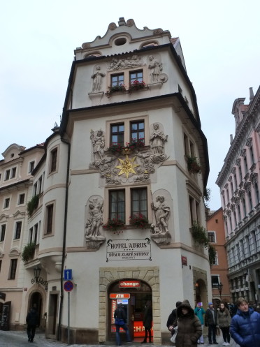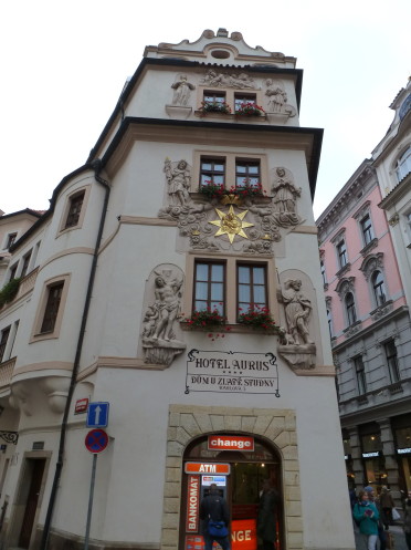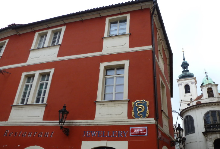 Яркое здание XV века на Карловой улице с домовым знаком в форме золотого змея совсем не старинная аптека, как вы могли подумать.
