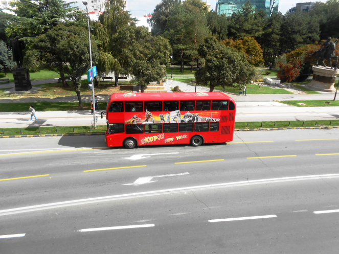 Вы наверно тоже заприметили красный двухярусный автобус у Арки? Старый автобусный парк был разрушен еще при земплетресении, поэтому власти Македонии заказали у китайцев в 2010 году порядка 200 уникальных (специально для Македонии) автобусов. И теперь псевдолондонские автобусы можно встретить на центральных улицах Скопье.