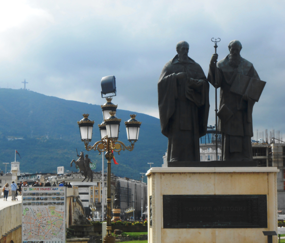 и памятника Кириллу и Мефодию с Крестом тысячелетия на заднем плане, который был поставлен на горе Крстовар в честь принятия страной христианства.