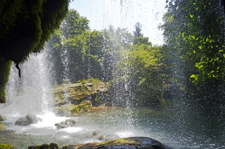 За него можно зайти по дорожке и посмотреть на окружающий пейзаж сквозь падающую воду.