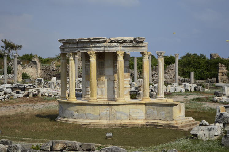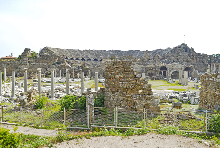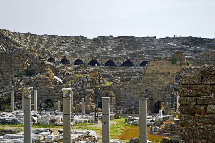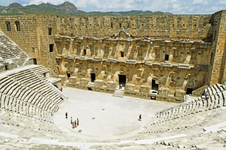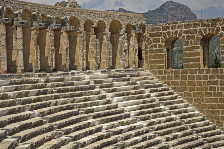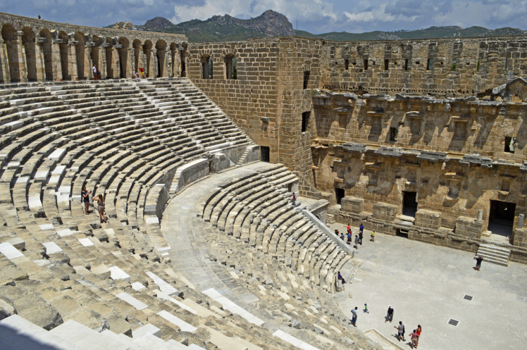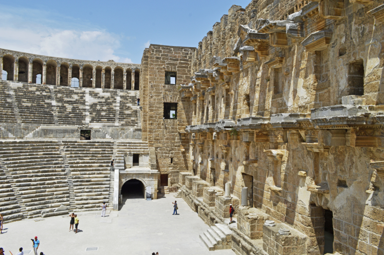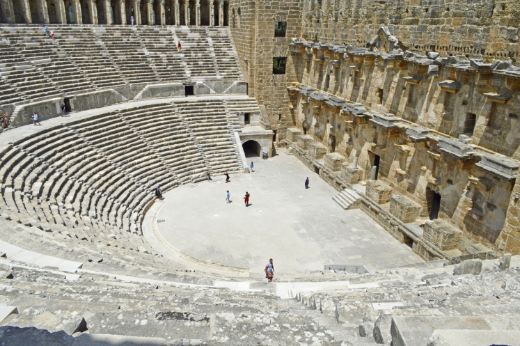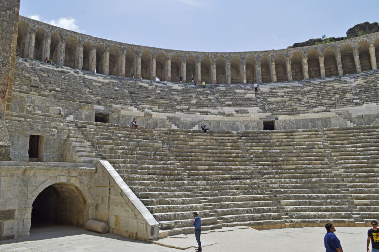 Амфитеатр Аспендоса сохранился намного лучше всех других театров Турции,хоть и построен он во II в.,во времена правления Марка Аврелия.Монуметальное строение имеет 96 м. в диаметре, 39 рядов,на которых могли бы разместится около 17000 зрителей!